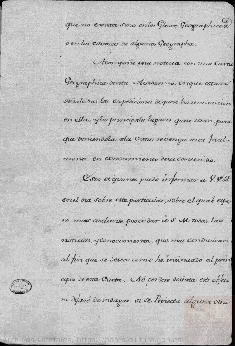 Esto es quento puedo informar a V.E. en el día, sobre este particular, sobre el qual espero más adelante poder dar a S.M. todas las noticias y conocimientos que más conduzcan al fin que se dea como he insinuado al principio de esta carta. No perderé de vista este objeto, no dejaré de indagar si se Proyecta algua otra expedición aunque hasta la Paz no es regular que suceda.