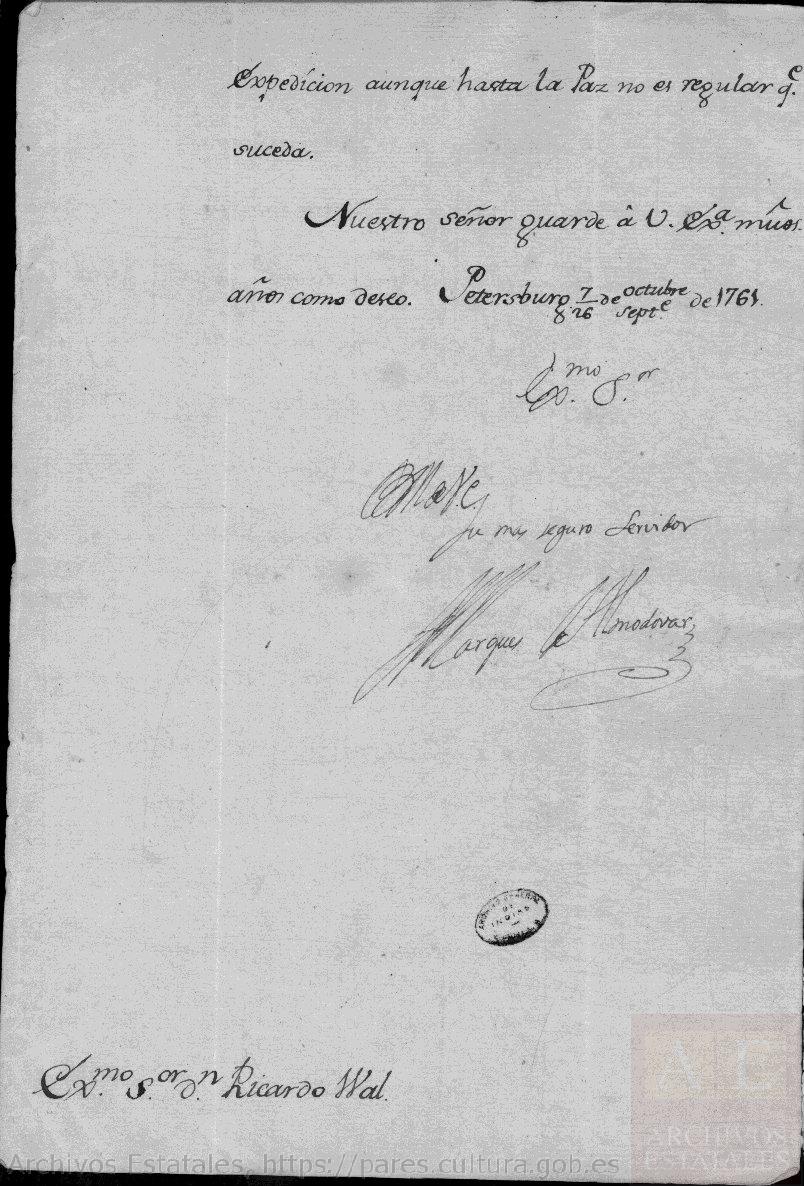 Nuestro Señor guarde a V.E. muchos años como deseo. Petersburg 7/26 de octubre/septiembre de 1761.