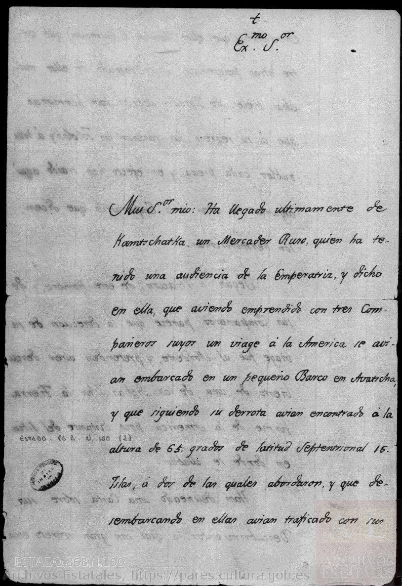 Informe del vizconde de Herrería, don Álvaro de Navia Osorio y Bellet, ministro plenipotenciario español en San Petersburgo, dirigido al Exmo. Sr. marqués de Grimaldi, ministro de Estado del reino de España, sobre los descubrimientos realizados por comerciantes rusos en aguas del Pacífico norte desde la península de Kamtchatka, fechado el 30 de marzo de 1764.