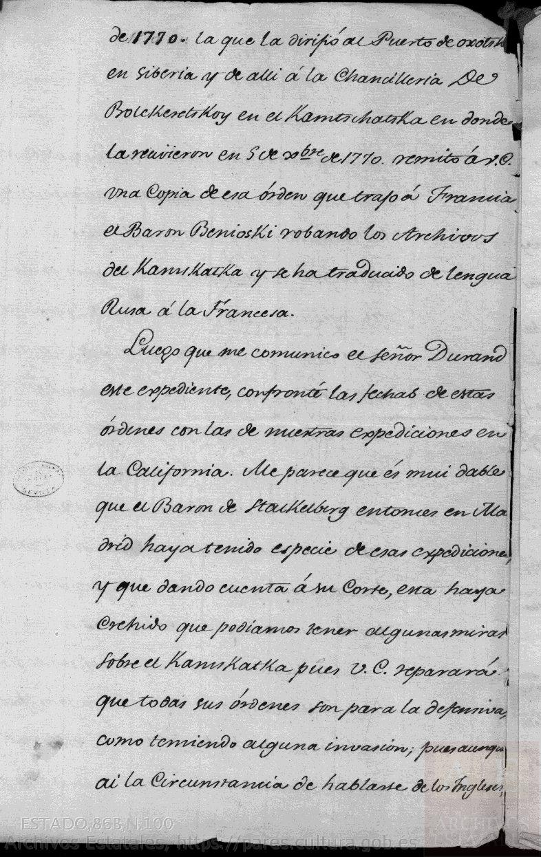 Luego que me comunicó el señor Durand este expediente, confronté las fechas de estas órdenes con las de nuestras expediciones en la California. Me parece que es mui dable que el Barón de Stalkelberg, entonces en Madrid, haya tenido especie de esas expediciones y que dando cuenta a su Corte, ésta haya crehido que podíamos tener algunas miras sobre el Kamtschatka, pues V.E. reparará que todas sus órdenes son para la defensiva, como temiendo alguna invasión; pues aunque ai la circunstancia de hablarse de los Ingleses, suponiendo de podían venir con algunos navíos al Puerto de Oxotskoy o al de Kamtschatka, es dable que esta Corte les haya participado sus recelos y que entonces se hayan empeñado en ayudar a los Rusos por esa parte en caso de invasión, y que considerando después con madurez que no podía nunca ser nuestro interés el pensar en la expedición de un país tan áspero, tan frío y de tan pocos recursos como el Kamtschatka, que por estos motivos no se ha verificado su auxilio.