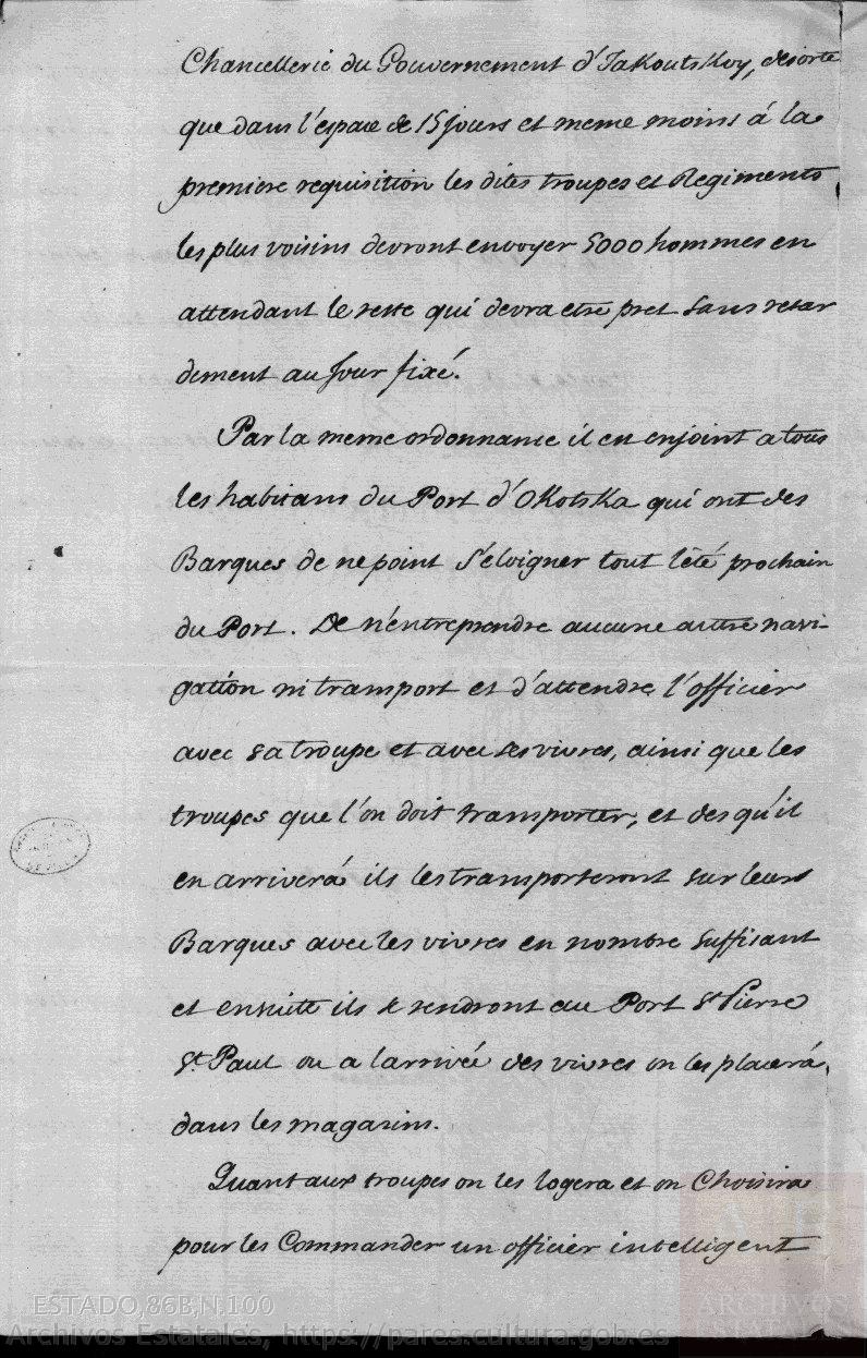 A su llegada aquí me comunicó el señor Durand una copia de una orden dada por este Gobierto en 1 de octubre de 1769 y pasada a la Chancillería de Iskouskoy en 3 de maio de 1770, la que dirigió al puerto de Oxotk en Siberia y de allí a la Chancillería de Bolckerstikoy en la Kamtschatka en donde la recivieron en 5 de octubre de 1770. Remito a V.E. una copia de esa orden que trajo a Francia el Barón Benioski robando los Archivos de Kamtschatka y se ha traducido de lengua Rusa a la Francesa.