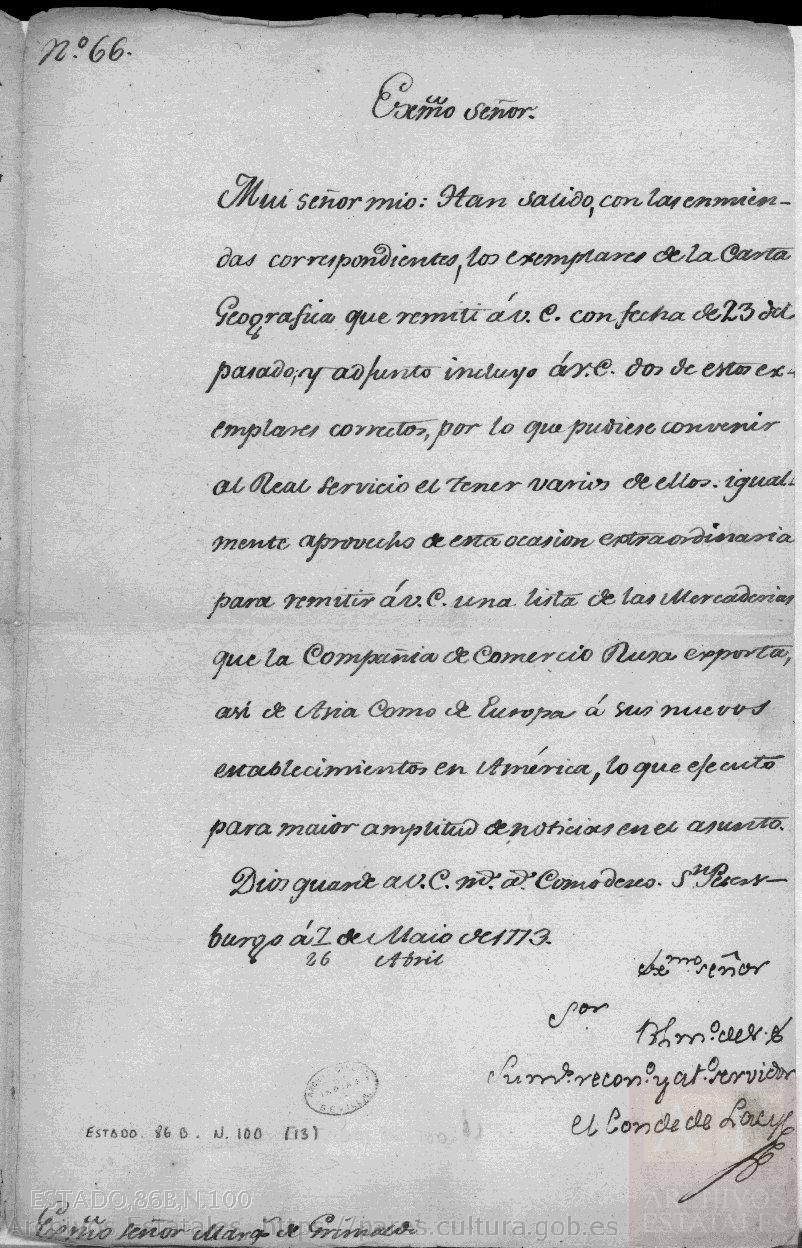 Carta nº 66 de don Francisco Antonio de Lacy, conde de Lacy, al marqués de Grimaldi, remitiendo dos ejemplares de la carta geográfica ya corregida y una lista de las mercancías que la compañía de comercio rusa exporta de Asia y Europa a sus establecimientos en América, fechada el 7 de mayo de 1773.