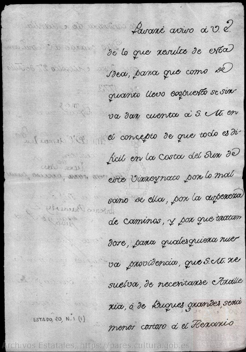 Pasaré aviso a V.E. de lo que resulte de esta idea, para que como de quanto llevo expuesto se sirva dar cuenta a S.M. en el concepto de que todo es difícil en la Costa del Sur de este Virreynato por lo malsano de ella, por la aspereza de caminos, y por que tratandose, para qualesquiera nueva providencia que S.M. resuelva, de necesitarse Artillería, o de Buques grandes, será menos costoso a el Herario se conduzca de Manila.