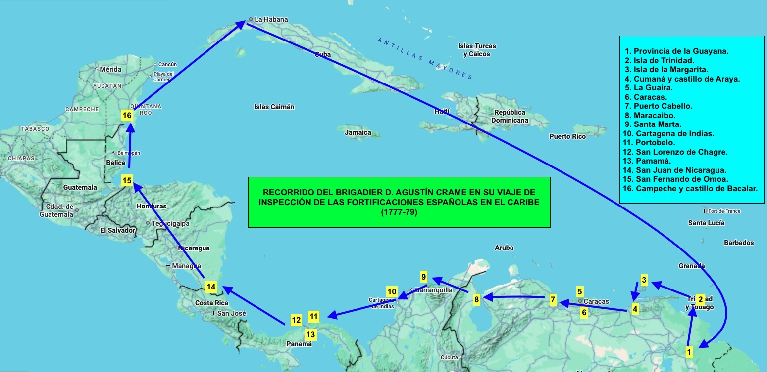 En este estado de cosas, y previendo un posible enfrentamiento con los británicos, el gobierno español quiso saber el estado de las defensas, fortificaciones y guarniciones del Caribe, y se fijó en el Ingeniero en jefe don Agustín Crame, que había sido ascendido a brigadier en 1776[02], nombrándole “visitador general de las fortificaciones de América”, cargo que lo mantendría ocupado los dos años y medio siguientes y que le llevaría a recorrer todo el Caribe sur español. El teniente general Inspector de Infantería, el conde de O’Reilly, le remitió unas instrucciones fechadas el 7 de mayo de 1776 en las que se ordenaba reconocer las islas de Trinidad y de Margarita, y las plazas y provincias de Cumaná, Guayana, Puerto Cabello, Santa Marta, Cartagena, Portobelo, Río Chagre, Omoa, Castillo de San Juan Nicaragua, y Campeche y que “en dicha última Provincia conviene tomar el posible conocimiento del establecimiento de los ingleses en Honduras y lo que se podría emprender contra ellos en caso de guerra”[03].
