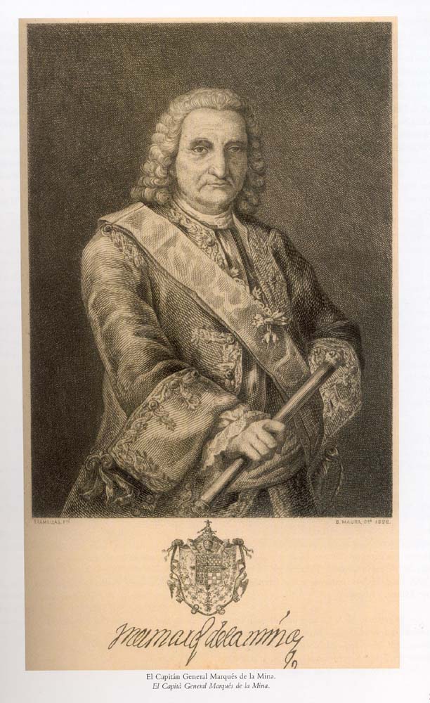 CAPITÁN GENERAL D. JAIME DE GUZMÁN Y SPÍNOLA MARQUÉS DE LA MINA (1690 - 1767) Capitán General de Cataluña D. Jaime de Guzmán y Spínola, marqués de la Mina, nació en Sevilla en 1690. Como joven oficial participó en la Guerra de Sucesión militando en las filas del rey D. Felipe V. Posteriormente, intervino en las campañas de Sicilia, Cerdeña (1718-20) e Italia (1743-46). Fue también un distinguido diplomático, siendo embajador en París entre 1736 y 1740. Designado Capitán General de Cataluña, ejerció el cargo entre 1749 y 1767, año en el que falleció con 77 años, siendo enterrado en la iglesia de San Miguel del Puerto. Fue un gran impulsor de las obras públicas en una Barcelona ceñida a sus murallas. Entre las obras más destacadas están los accesos a la ciudad, el buen estado de las conducciones de agua y el empedrado e iluminación de las calles. Pero las grandes obras del marqués fueron las construcciones de la Barceloneta; la limpieza y dragado del puerto, que estaba casi cegado por la acumulacion de arena, impidiendo el tráfico portuario y originando zonas encharcadas que eran focos de infección. Pero las grandes obras militares del marqués fueron la reconstrucción del castillo de Montjuich y la construcción del castillo de San Fernando (Figueras), obras que encargó al Ingeniero General D. Juan Martín Zermeño. Como oficial de Caballería, fue primer coronel del Regimiento de Lusitania. Era partidario de la carga al arma blanca contra el enemigo: "La Caballería no usará jamas del fuego para el ataque, sino la espada, y del sable los Dragones [...] la carabina, la pistola y el fusil son para cargar a los que se retiran."