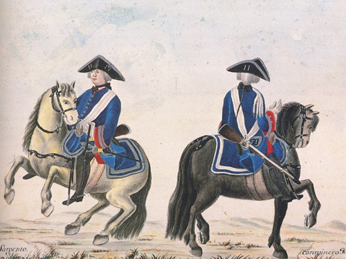 Brigada de Carabineros Reales, reinado de Fernando VI. Estado Militar, Anne Brown, Rhode Island, USA. En 1742 se asignó a la Casa Real para aumentar los efectivos de combate de la misma, basados hasta la fecha en los dos regimientos de Guardias Españolas y Guardias Valonas. En 1808 estaba constituida por cuatro escuadrones de línea y dos escuadrones ligeros para formar la Guardia de Honor. Cada escuadrón estaba formado por dos compañías. Su fuerza total eran 540 de tropa y 490 caballos (estado de fuerzas de 1 de mayo de 1.808). |